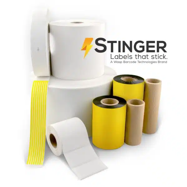 Thermal transfer technology uses a ribbon to transfer an image onto the label material. Direct thermal technology does not require a ribbon. Instead, a chemically coated heat-sensitive material produces images as heat is applied to the surface. Stinger labels work with Wasp barcode printers as well as most every other major barcode printer brand, including Zebra, Sato, Intermec and Datamax O'Neil.