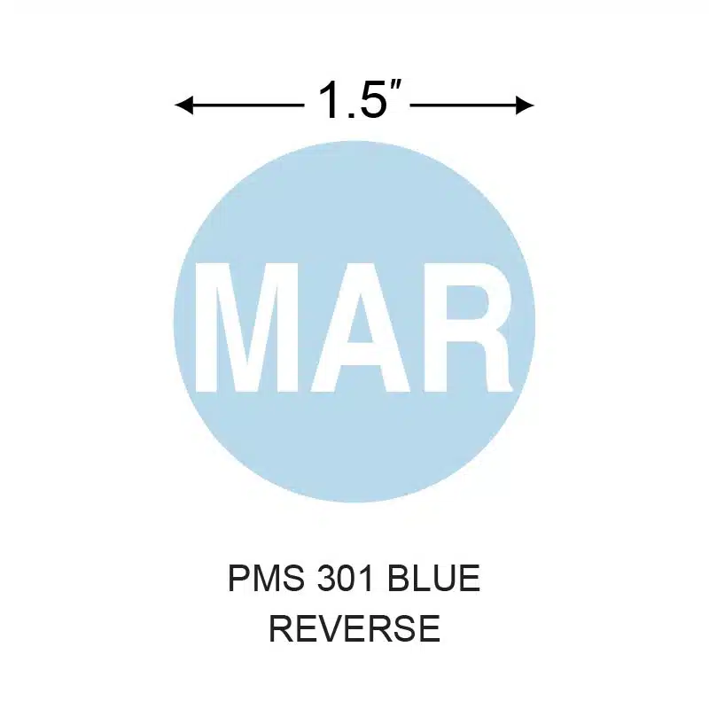 Stinger 1.5 in. x 1.5 in. Preprinted MAR Blue Reverse Circle Paper Label with Permanent Adhesive. 3 in. Core with 5 in. Outer Roll Diameter. 5 rolls per Case, 1000 Labels per Roll, Wound Out, Non-Perforated and 1 Label(s) Up.